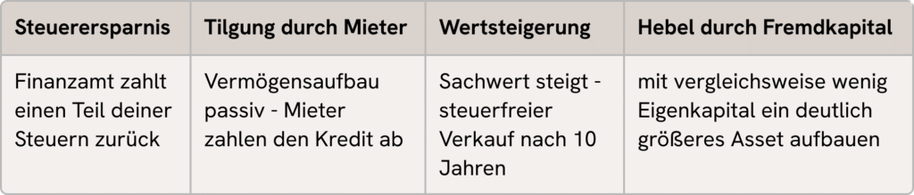 - Kombination aus Steuerersparnis + Tilgung + Wertsteigerung + Fremdkapital = vierfach Hebel auf das eingesetzte Kapital